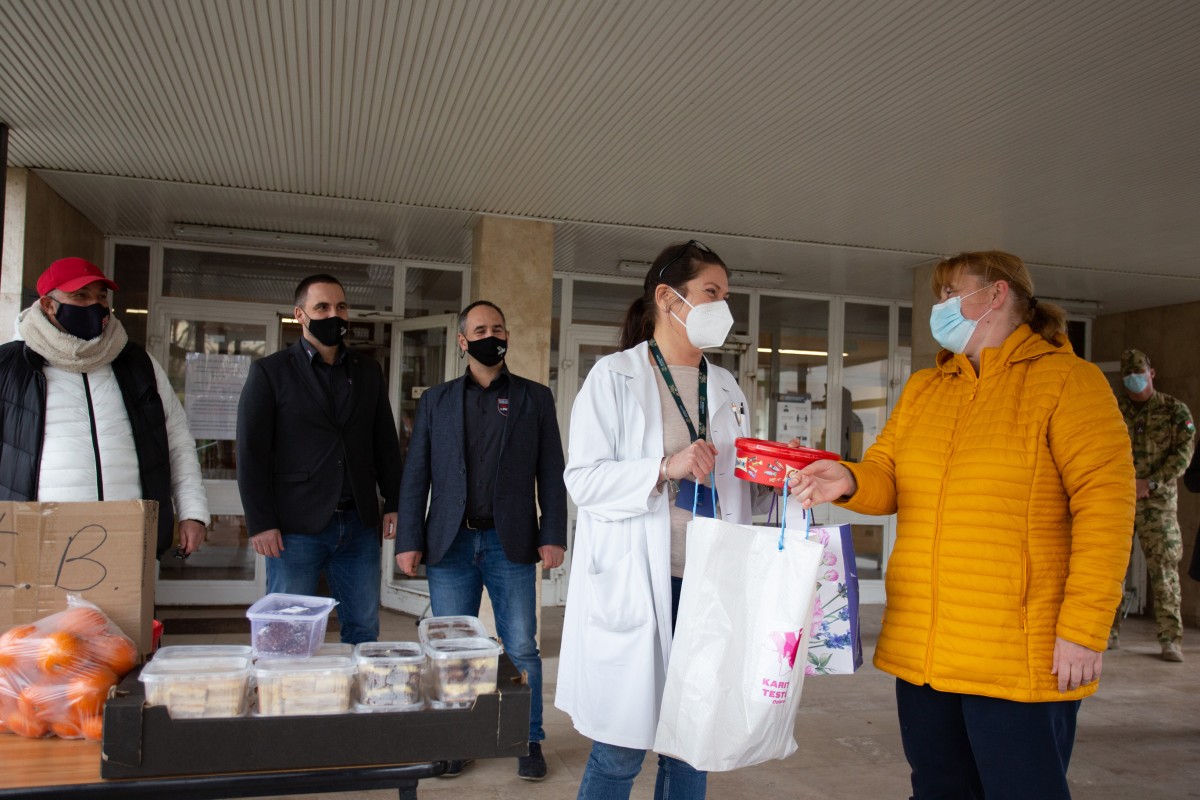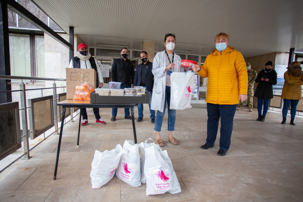 2021.03.17A Debreceni Karitatív Testület önkéntesei süteményeket, gyümölcsöt és édességet adtak át a Debreceni Egyetem, Klinikai Központ Kenézy Gyula Campusa Covid-ellátásban dolgozó munkatársai számára.